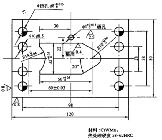 由于釆用了数控机床,模具零件的形状加工过程发生了很大的变化。如图(1)凹模板的加工,过去采用手工划线、钻床钻孔、带锯粗加工形孔、立铣加工型孔、手工攻锞纹五道工序。改用数控机床后,则由数控机床定位钻孔,减少了手工划线工序,而且孔位稍度有了提高,如果使用加工中心,则一次装夹可完成所有加工内容。由于减少了装夹和工序转移的等待时间,大幅度缩短了加工周期,同时也减少了多次装夹带来的孔位误差,提高了加工精度。